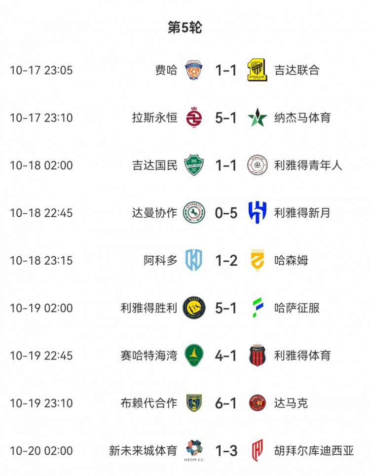 10月20日讯 沙特联第五轮,共有40粒进球产生,仅利雅得新月完成零封。