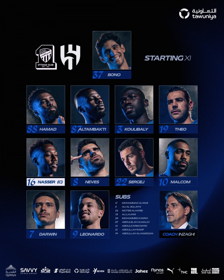 利雅得新月首发:37-布努、19-特奥、3-库利巴利、87-坦巴蒂、88-哈马德-亚米、10-马尔科姆、22-米林科维奇、8-鲁本-内维斯、16-纳赛尔-多萨里、9-莱昂纳多、7-努涅斯
