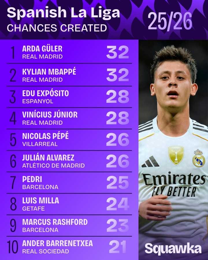 11月12日讯 Squawka统计本赛季西甲创造机会次数,居莱尔、姆巴佩32次最多。