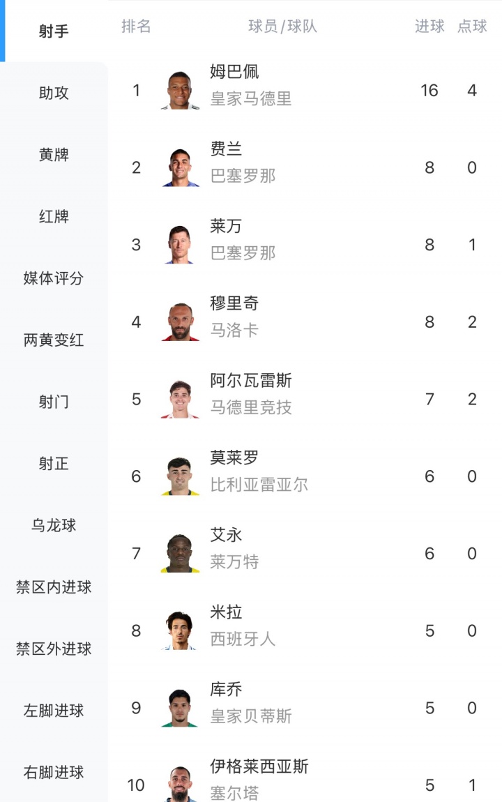 姆巴佩以16球领跑西甲射手榜,费兰、莱万和穆里奇均8球,阿尔瓦雷斯7球。